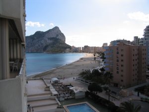 1) Ankunft in Calpe: 26°C, Palmen und Hotel mit Blick auf den „Brocken“ und das Meer